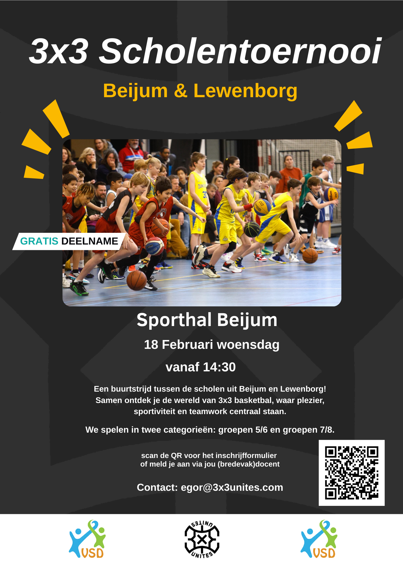 18 Februari 3×3 (basketbal) scholentoernooi Beijum & Lewenborg. Meld je nu aan ! Scan de QR-code om je aan te melden of meld je aan via de gymleraar. Het toernooi is voor de groepen 5/6 en 7/8 en alle niveaus zijn welkom! Author: Nanouk Usmany